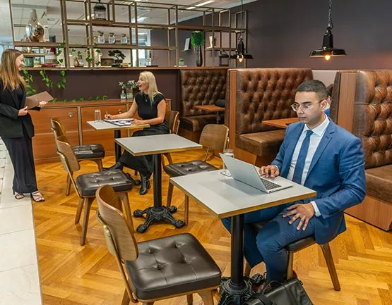الوصول إلى قاعات اجتماعات مجهزة بالكامل ومساحات عمل مشتركة عند الطلب.